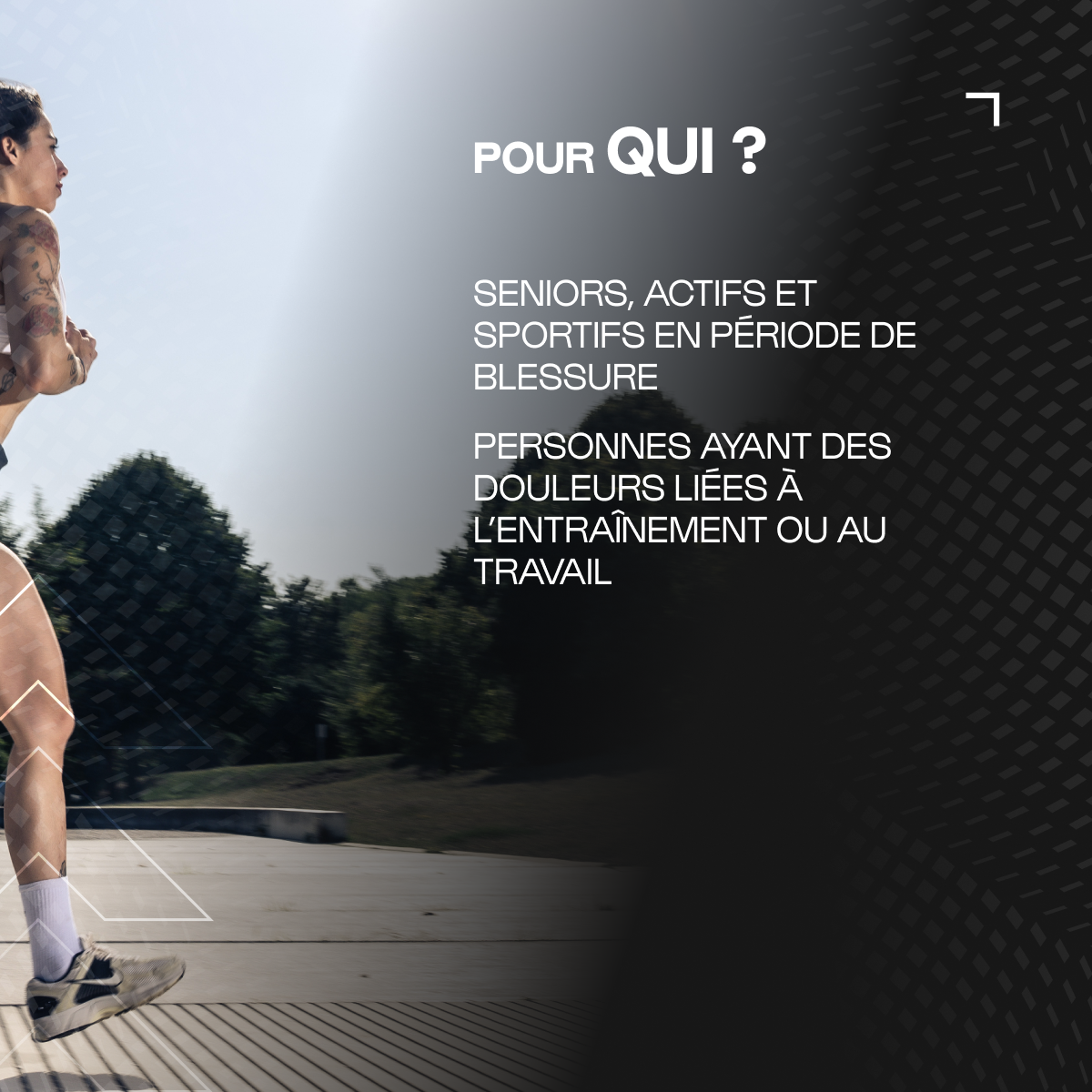 Ce pack s’adresse aux sportifs réguliers ou confirmés, aux pratiquants en phase de récupération ou de reprise après une période intensive, ainsi qu’à toute personne souhaitant restaurer son confort articulaire et préserver sa mobilité sur le long terme.